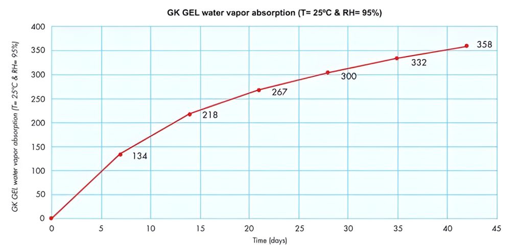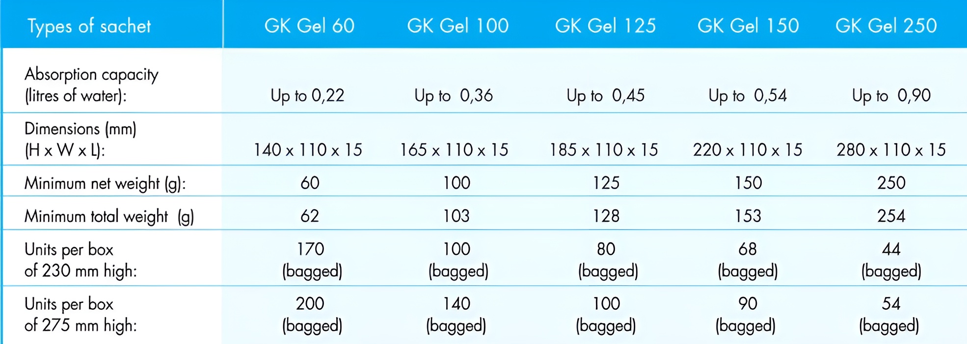 The GKGel sachet is based on the proven ability of calcium chloride to absorb moisture from the environment very effectively. The GKGel sachet absorbs up to 360% of its weight in water. The water absorbed forms a gel that is retained inside the sachet, thus avoiding the typical leakage of traditional desiccants.
